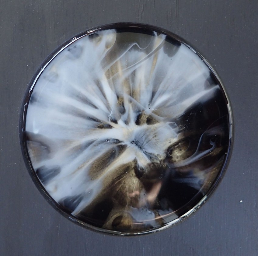 Published April 3, 2018 at 2371 × 2352 in my anothermicroworld (3) – gilded saga in black and white (10 / 1-10). mixed media: resin, acrylic paints, inks and metallic pigments, embedded in plywood.