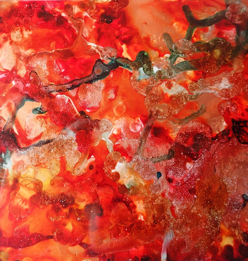 Published Juli 22, 2017 at 3030 × 3194 in lapland impressions (5) – antlers as an offering to the mother earth. mixed media, alcohol inks, acrylics, gold pigments, resin etc. on ceramics and plywood. acrylic inks, resin