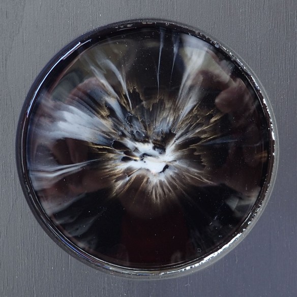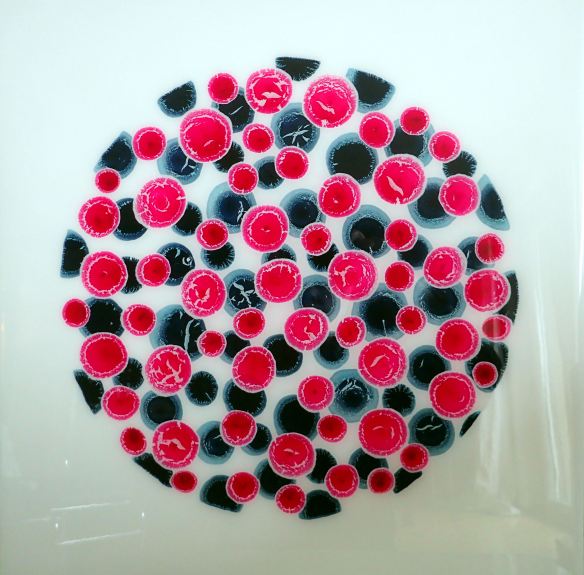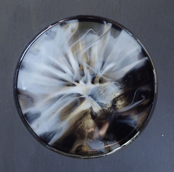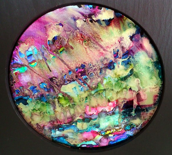 my anothermicroworld (5) – thoughts are sometimes jewels: mixed media, inter alia inks, acrylic paints, metallic pigments, oil based pens, layered resin in plywood (40 x 40 cm).