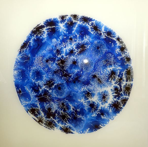 my anothermicroworld (4) – sometimes blue: mixed media, inter alia inks, metallic pigments, layered resin – in plywood (40 x 40 cm)