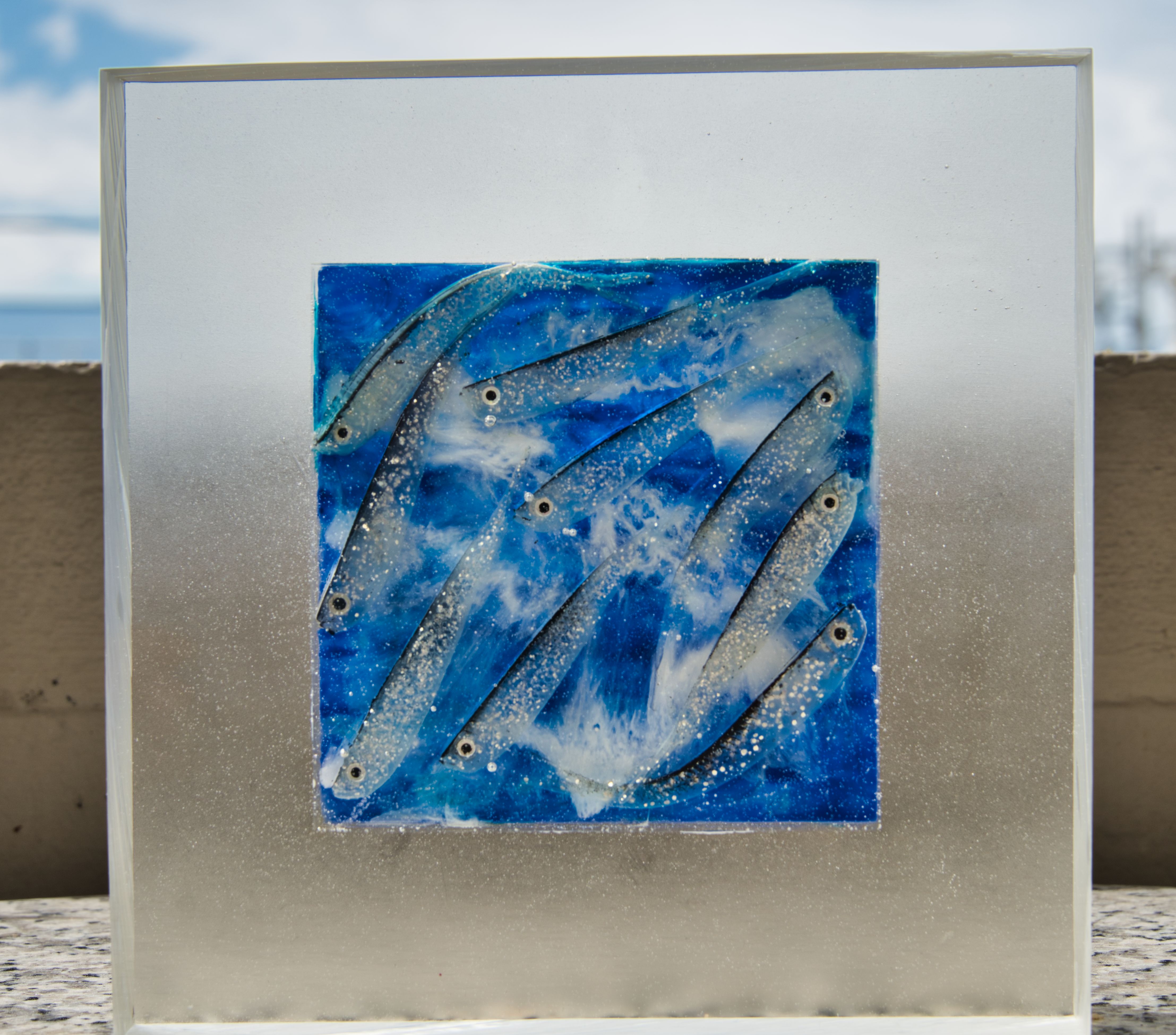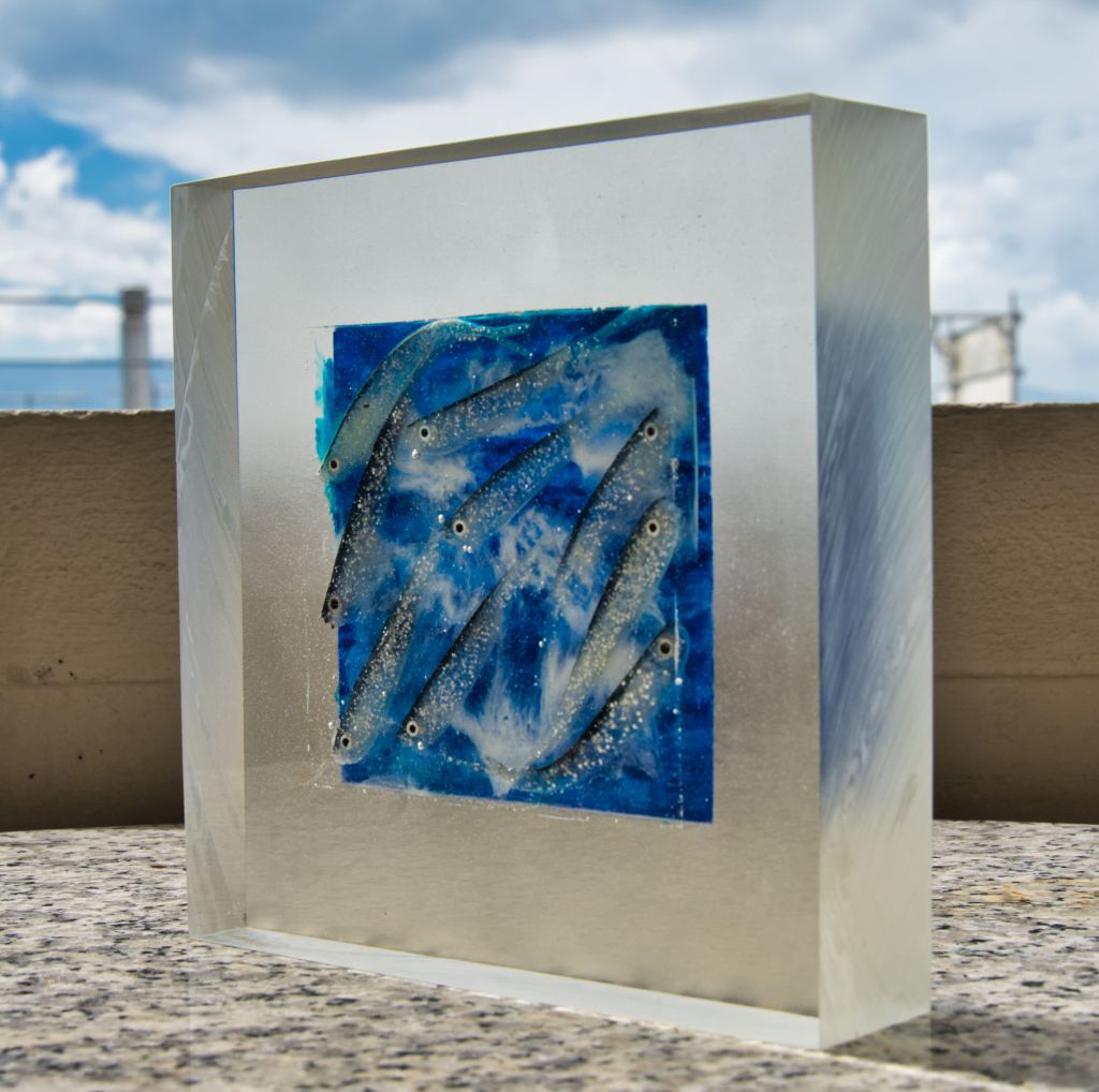 acrylics, tyvek and other stuff in bio-resin /20x20x5cm/and the weight is about a ton 😉😇