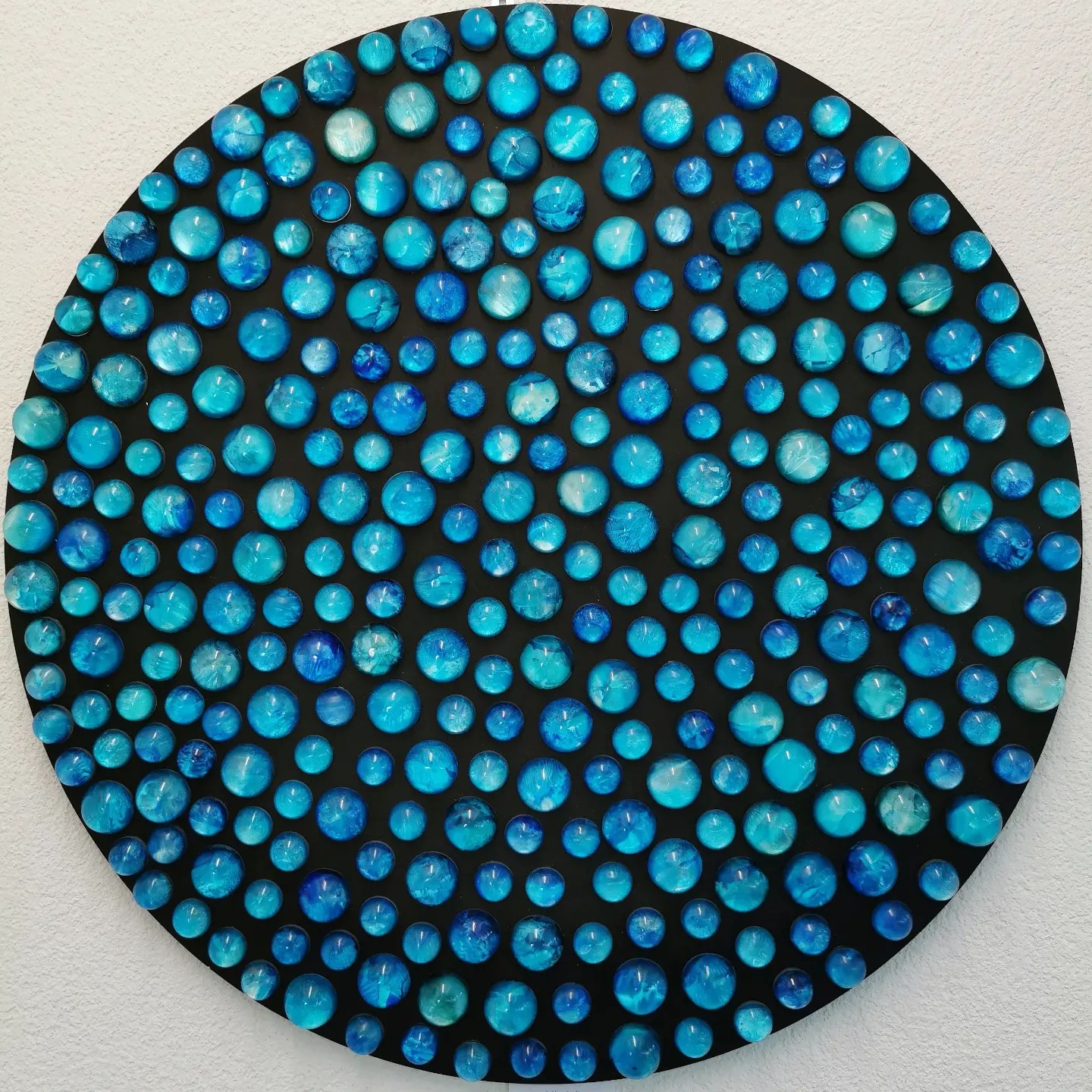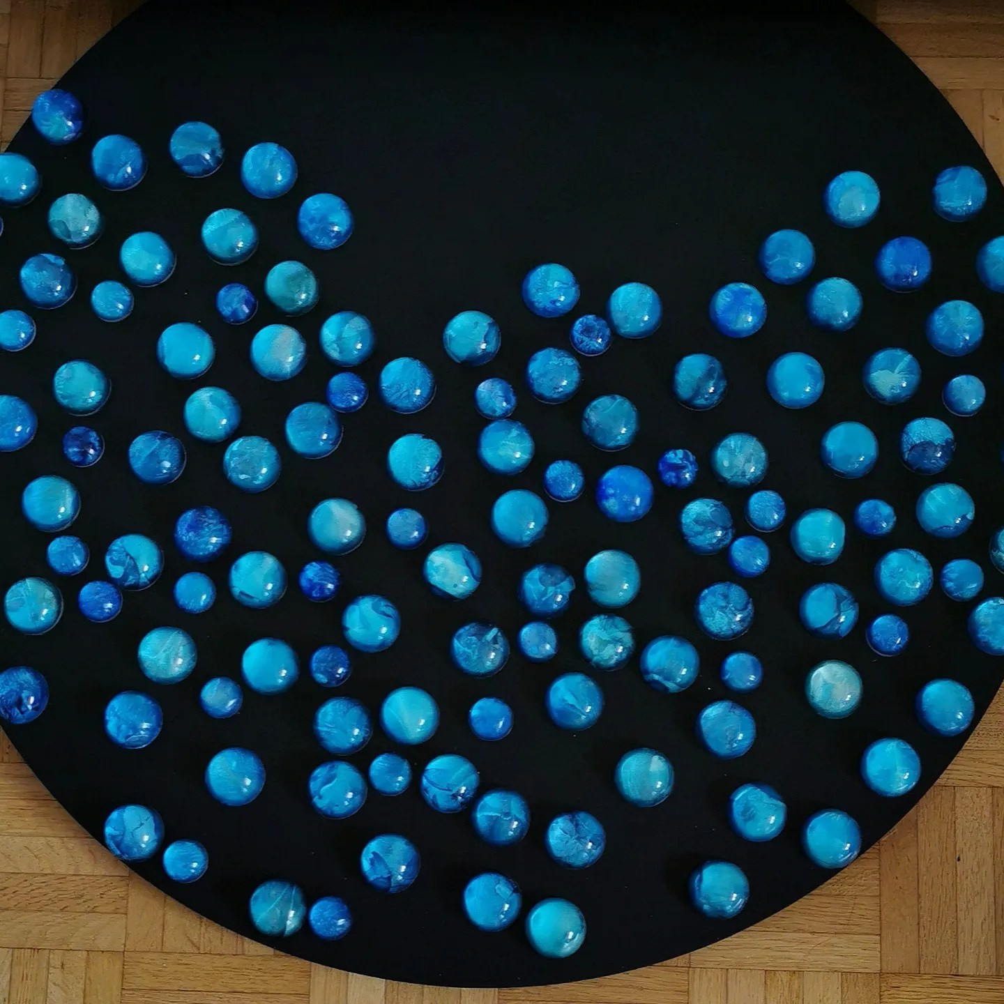 I call this work „the blue hour“ in lapland. tiny acrylic paintings embedded in resin spheres, on wooden canvas (80 cm).