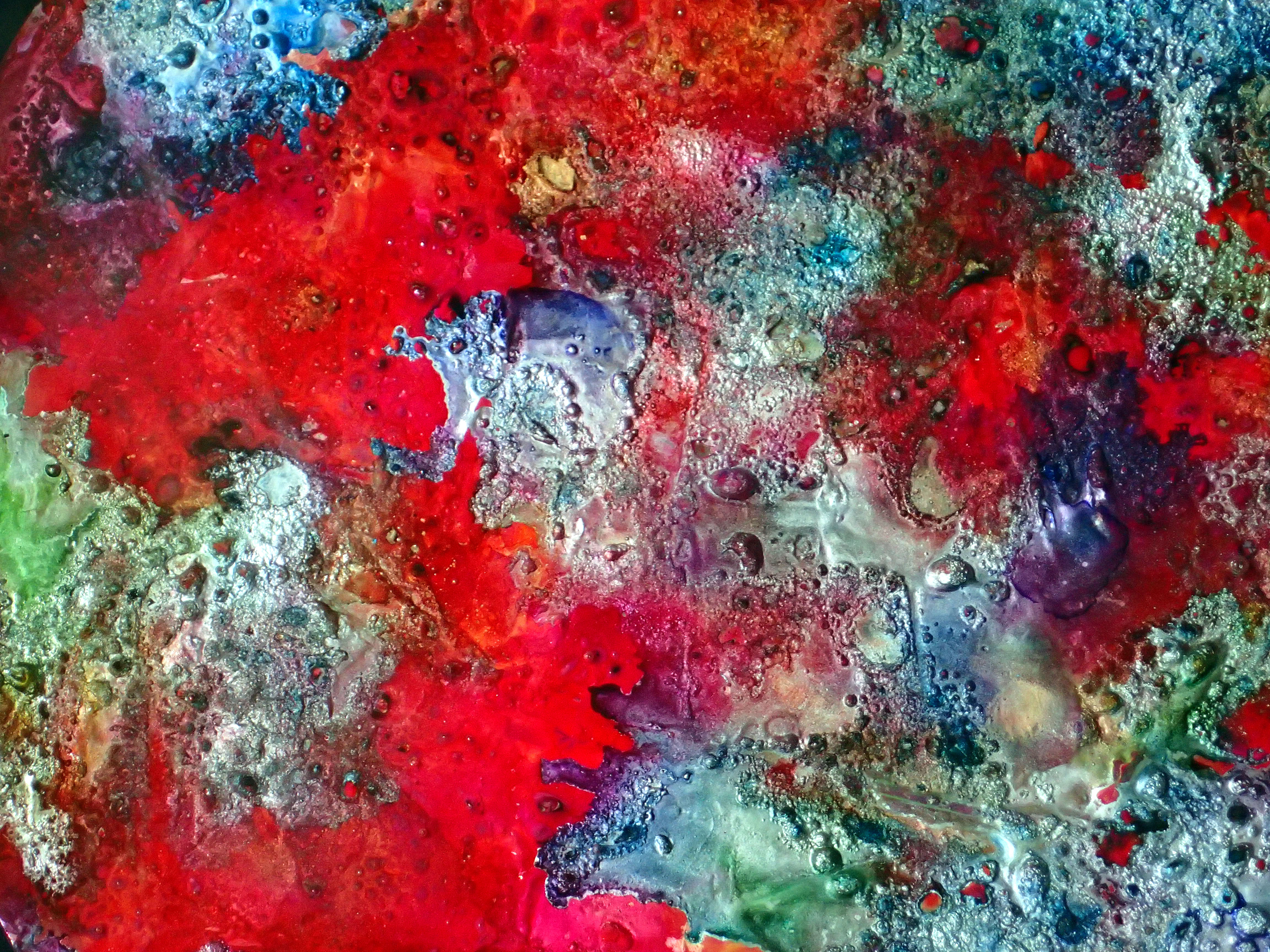 the work was born last summer (2017) in my cottage in finland/lapland, some 200 kilometers to the north of the arctic circle. i had kind of home chemistry over there, experimenting with different materials: acrylic paints, inks, chemicals, water and fire… i really could enjoy painting to the fullest, ‚cause the sun didn’t set… mixed media: layered bioresin with acrylics, inks, metallic pigments etc. on metal.